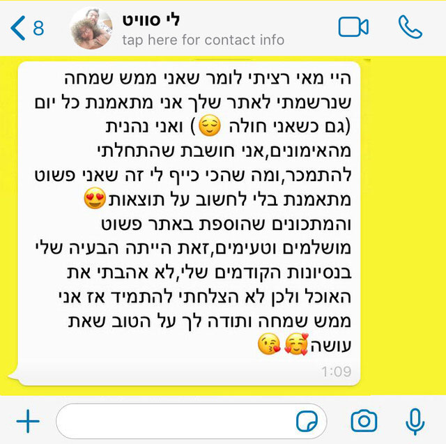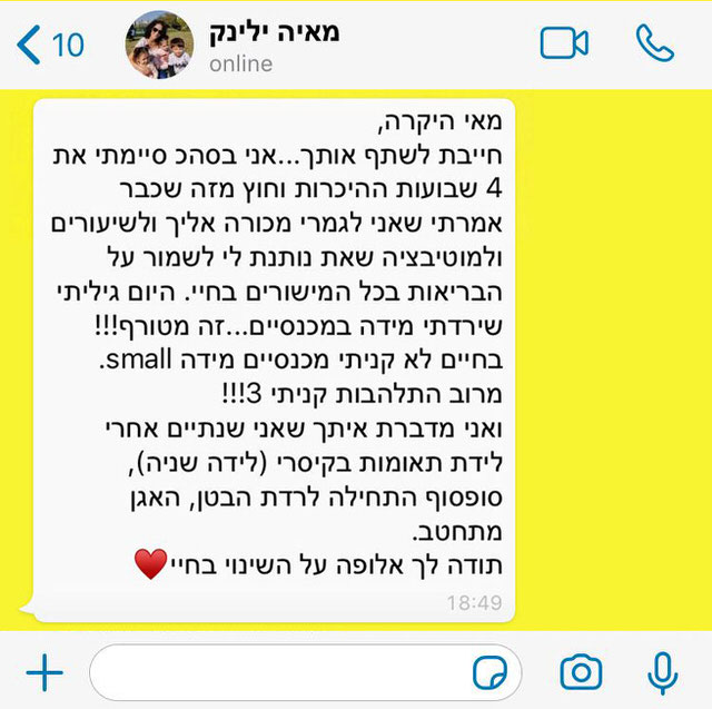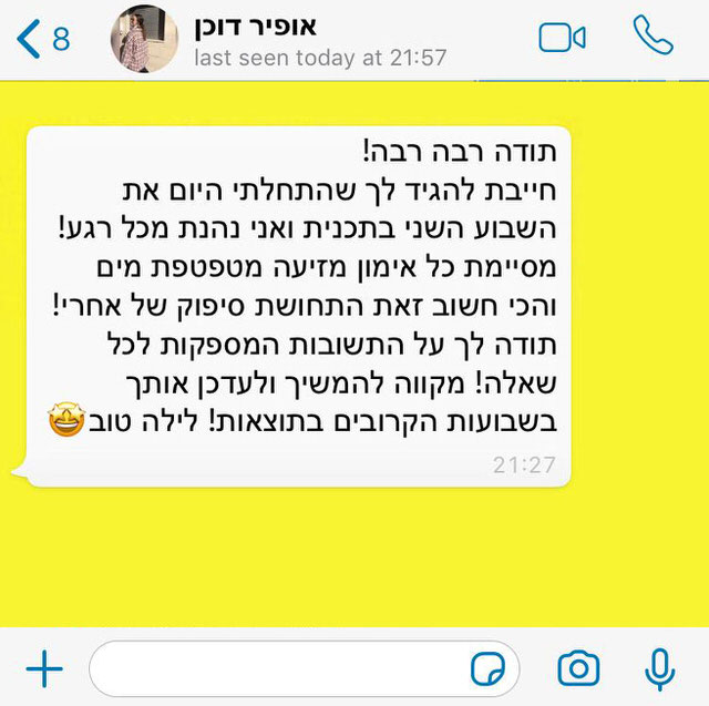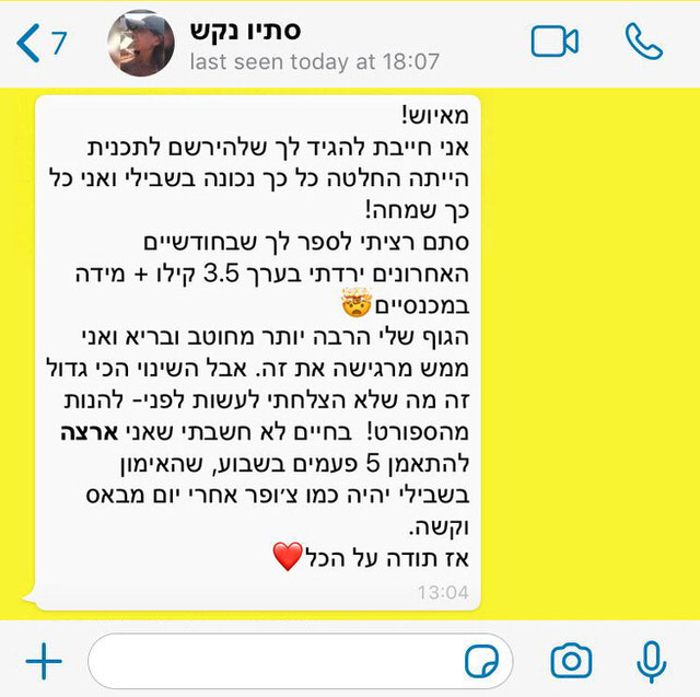 בניתי את התוכנית במקצועיות, בקפידה ובהתאמה מירבית לנשים הללו, ואני מזמינה גם אותך להתחיל את השינוי שלך ולהצטרף עוד היום לתוכנית שתשנה את החיים שלך ובעיקר- תגרום לך לחזור לאהוב את עצמך.