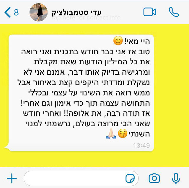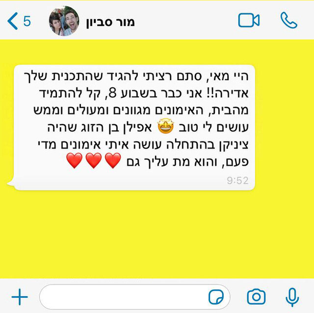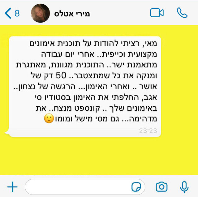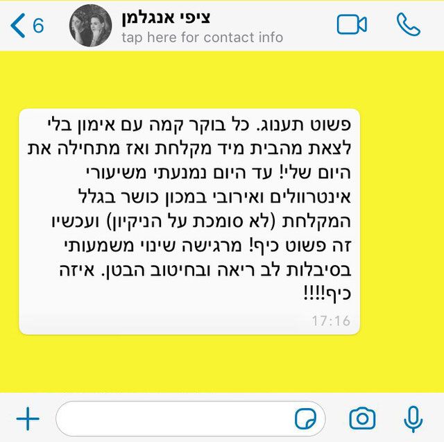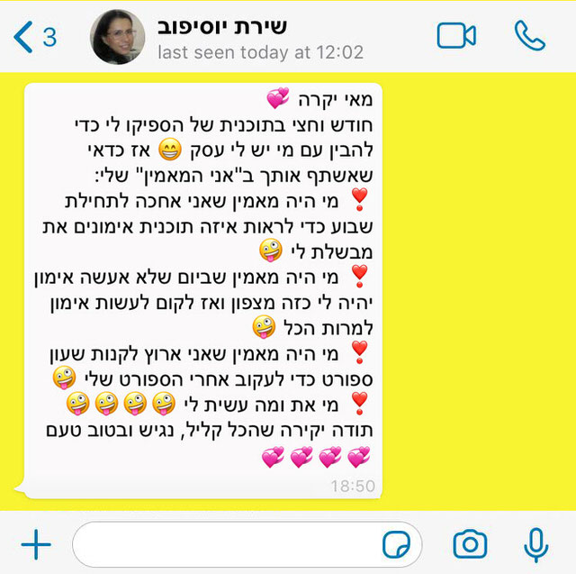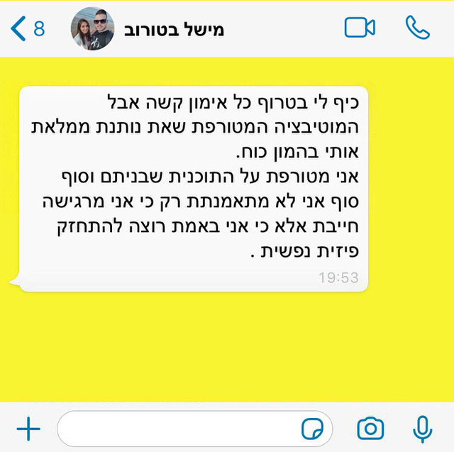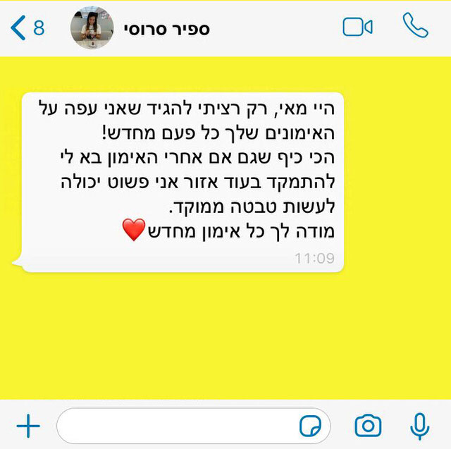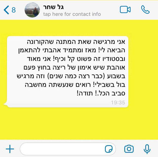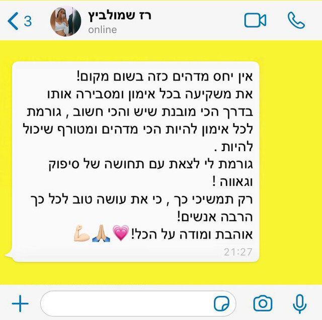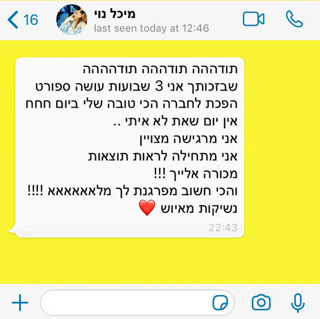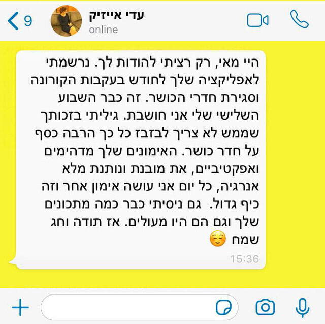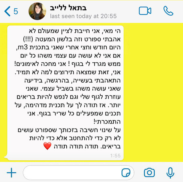הקמתי את מיזם האימון הדיגיטלי שלי כדי להעניק לכל אישה שרוצה להכנס לכושר, להתאמן ולחזור לאהוב את עצמה ואת הגוף שלה, איפה ומתי שרק תרצה, בקצב ובנוחות שלה. לאחר הצלחת המיזם, החלטתי לפתוח גם תוכנית שתתאים לנשים שצריכות אימון בקצב קצת שונה- נשים אחרי לידה, בגיל המעבר או סתם נשים שספורט הוא לא "הקטע" שלהן.
