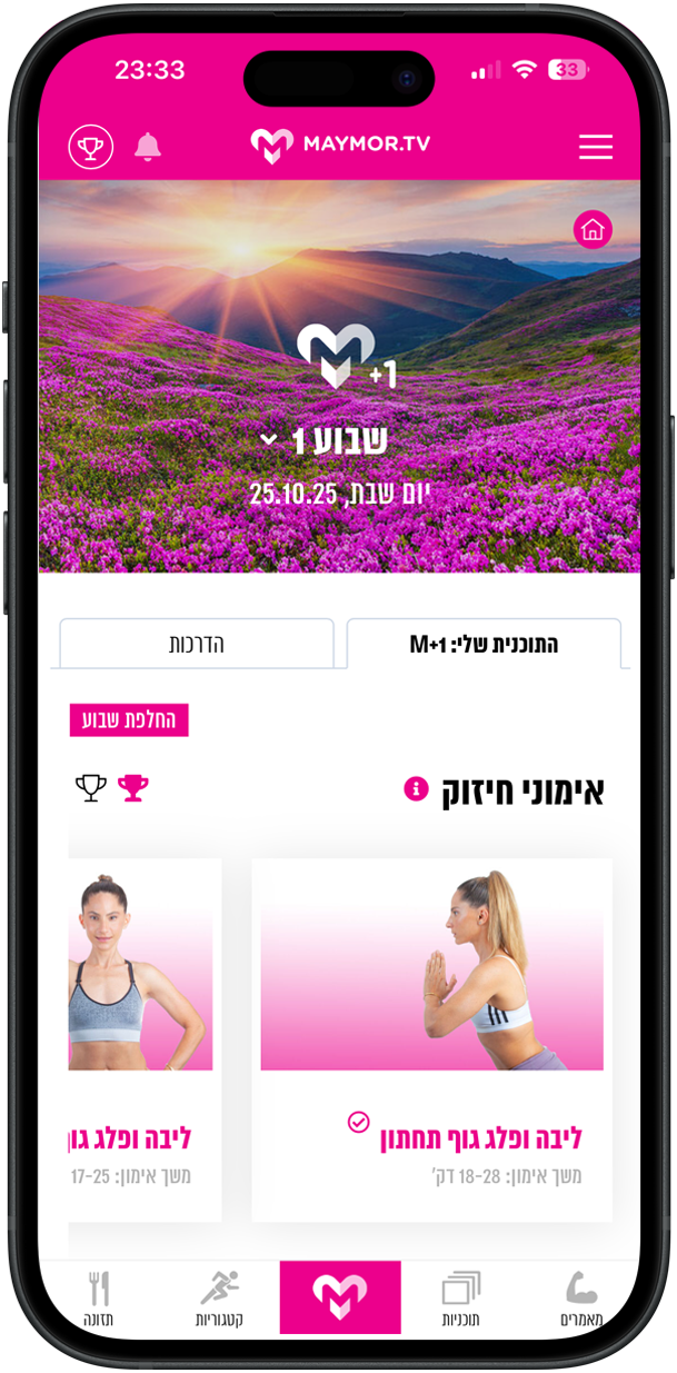 עם MAY MOR, תוכלי להתאמן מתי ואיפה שרק תרצי, בקצב שלך ובסביבה הטבעית שלך בעזרת אימוני וידאו מפורטים, מקצועיים ונגישים שיעזרו לך להכנס לכושר בקצב וברמה שלך. פיתחנו במיוחד את תוכנית האימונים M+1 במטרה לעזור לנשים להיכנס לכושר בדרך הבריאה, הנכונה והבטוחה ביותר. התכנית מספקת את כל הכלים החשובים שיעזרו לך לבנות יסודות חזקים ולחזור לגזרה, קצב שמתאים לך, ובעיקר לחזור לאהוב את עצמך ואת הגוף שלך.